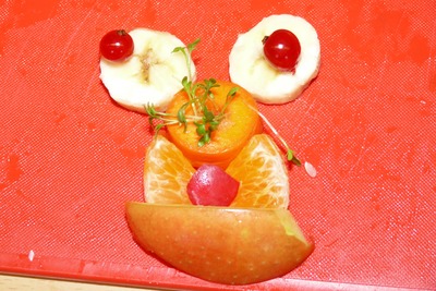 Umweltpädagogin Britta von Hoorn brachte die Tasche voll mit Obst und Gemüse, kleinen Messern und Holzbrettchen, sowie Bildern, die Gemüsekunst zeigten. Zunächst war die Frage, was denn da alles vorhanden war. Äpfel, Clementinen, Kiwis, Möhren, Radieschen, Gurken, Bananen, Heidelbeeren waren natürlich bekannt, aber was waren die grünen Teile im Topf? Schnittlauch und Kresse waren neu und wurden erstmal probiert. Na ja, der Geschmack ist noch nicht so prickelnd. Dann wurde geschnippelt und geschnitten, auseinandergefummelt und dann wieder zusammengelegt...bis die schönsten Gemüsebilder entstanden waren.
